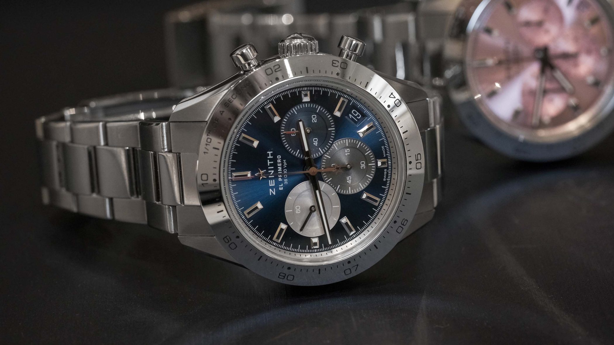 A quick word on the limited Chronomaster Sport “Pink”, a 500-piece release. This is part of Zenith’s ongoing effort to support breast cancer research. Valiant effort, and certainly a fantastic watch as well. If you can find one, grab one. The second is a standard (yet striking) blue-dial version with the brand’s signature tricolor subdials in grey, blue, and silver. Side by side, it’s a tough choice, but I’d say you can’t go wrong either way!