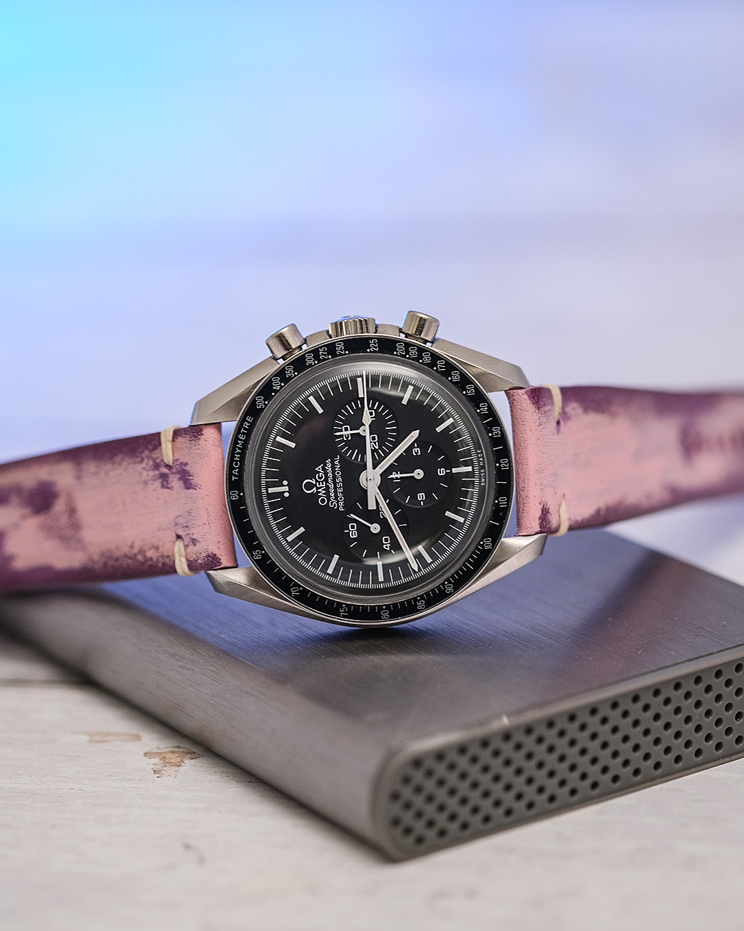 Each strap is hand-burnished and weathered, a meticulous process that gives them a worn-in, lived-in look, without sacrificing durability. In fact, strangely enough, this weathering makes the leather even tougher than in its natural state, rough and tough indeed. This results in straps that look absolutely glorious on the wrist, each one telling a story of craftsmanship and adventure. Among them, my personal favorite, against all odds, is the purple strap. Wild, unexpected, and absolutely splendid when worn on the wrist.