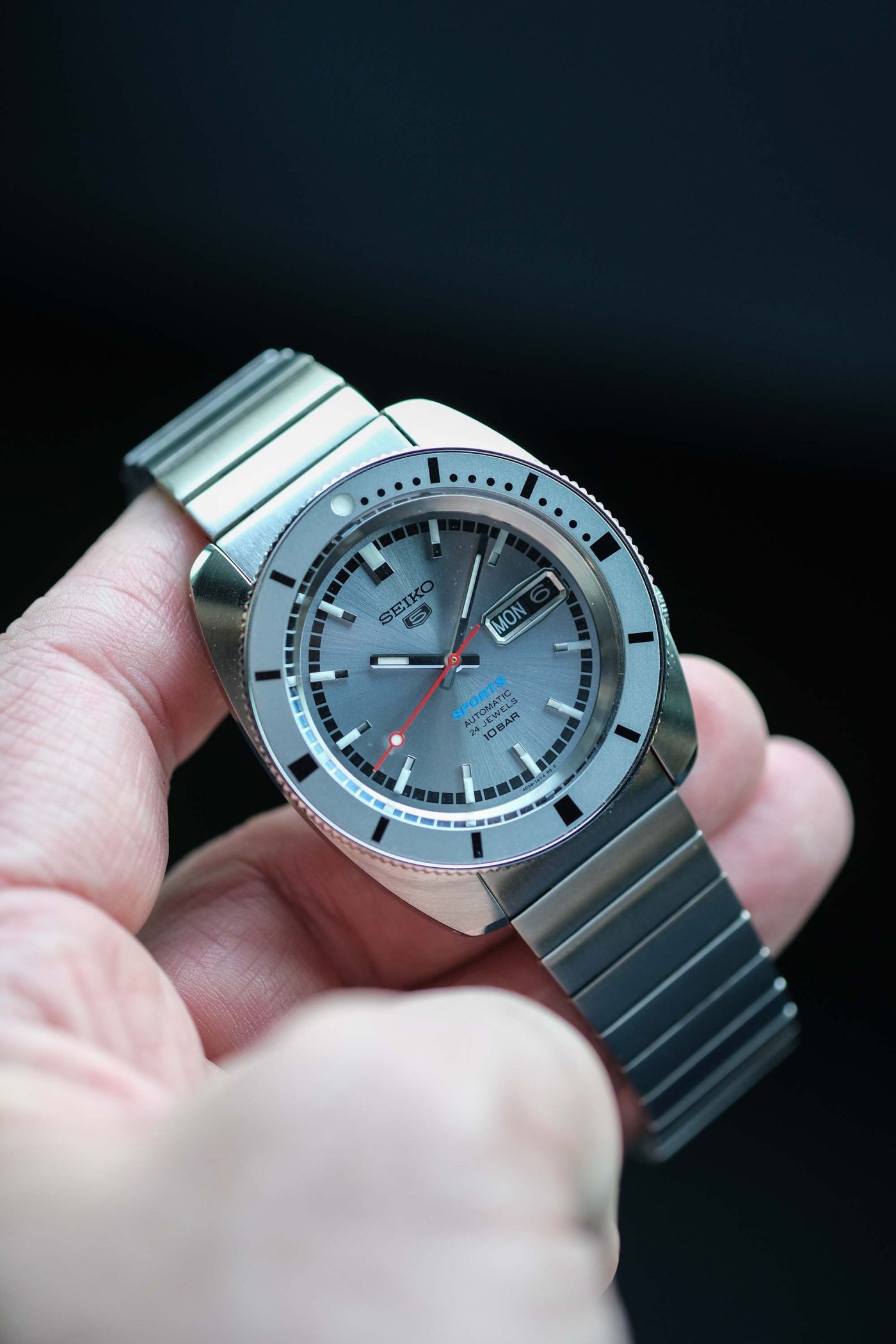 These watches wear easily and feel compact on the wrist, but not small due to the 45mm diameter and the 12.4mm thickness. They’re made of stainless steel with a “retro” brushed look to them (my words, not Seiko’s) and house a familiar domed Hardlex crystal up top. The screw-down crownCrown The knob on the outside of the watch that you typically use to either wind the mainspring or set the time [Learn More] and solid caseback help deliver 100 meters of water resistance, making this the perfect watch to take out and about, including on vacation and to the beach, when the last thing you want to worry about is water resistance and the toughness of your watch.