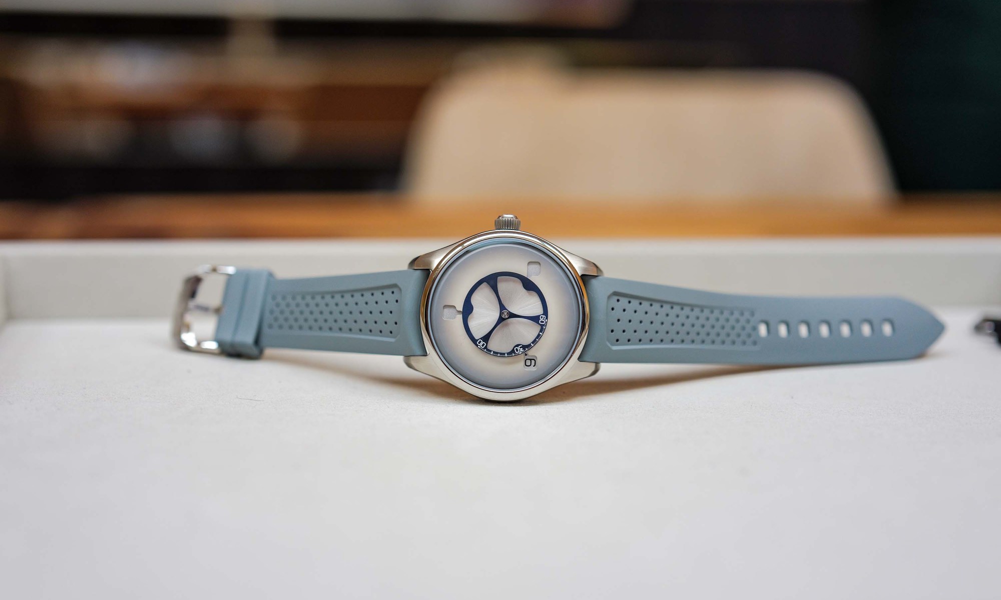 Instead of an hour hand, three satellite discs rotate beneath the dial. At the top of each hour, one disc jumps instantly into position while a skeletonizedSkeletonizing A decorative technique that involves removing some of the material from the movement parts to create a see-through effect, often used on the plates and bridges. [Learn More] central minutes disc sweeps across a 120-degree arc. Inside beats the in-house HMC 240 calibre, with a 72-hour power reserveRéserve de marche Also known as Power Reserve. A watch's power reserve refers to the amount of time a mechanical watch can run without being wound. The power reserve of a mechanical watch can vary depending on the size of the mainspring, the efficiency of the gear train, and the rate at which the mainspring releases energy. If a watch has a Power Reserve 'complication' it simply means that the status of the power reserve can be seen on the watch itself (either on the dial or movement side of the watch). [Learn More], Straumann hairspringHairspring The hairspring is a thin spring in a mechanical watch movement that is connected to the balance wheel. The balance wheel oscillates back and forth at a consistent rate, and the hairspring helps regulate these oscillations. The hairspring works by applying a restoring force to the balance wheel, which helps to keep the balance wheel oscillating at a consistent rate. The hairspring is also known as a balance spring. [Learn More], and flat overcoil for precision.